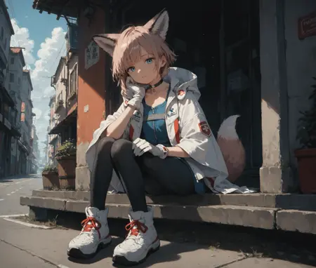 white jacket, blue shirt, black pantyhose, white gloves, choker, white footwear,
