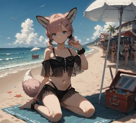 twintails, hairclip, black bikini, see-through, bare shoulders, headphones, ankle scrunchie