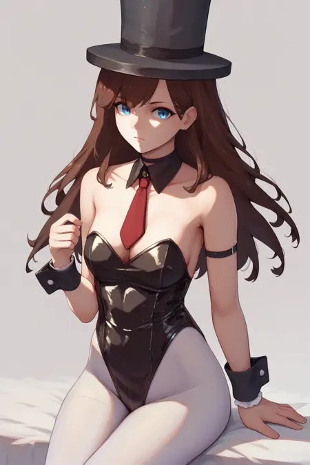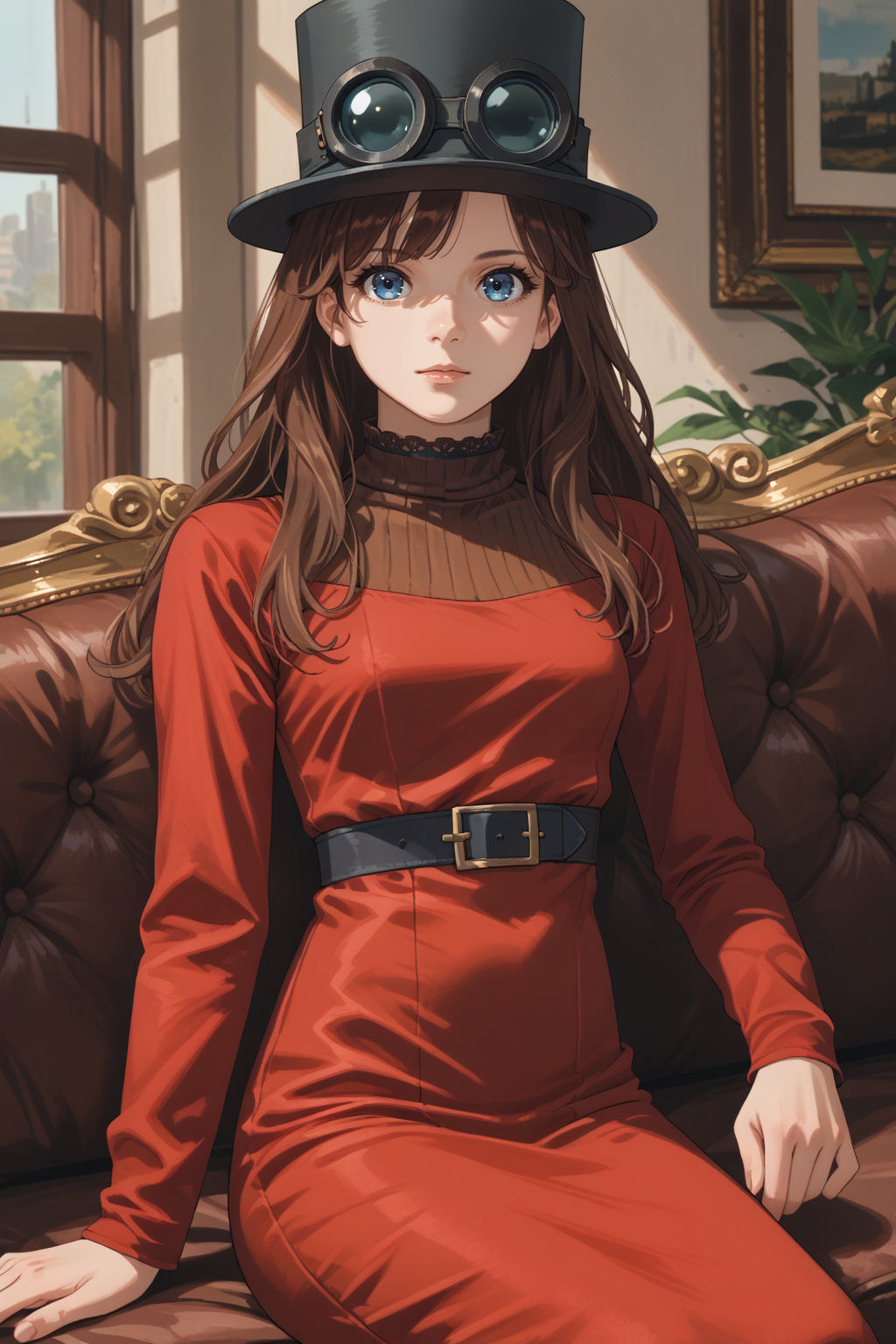 Real Main Prompt: NSStpumker, brown hair, long hair, blue eyes, top hat, goggles on headwear, black choker