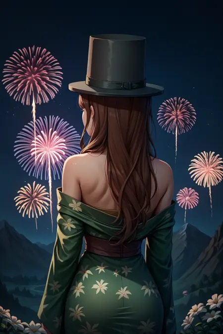 For her main outfit, please use: NSStpumker, brown hair, long hair, blue eyes, top hat, goggles on headwear, black choker, green jacket, open jacket, long sleeves, chest strap, khaki shirt, white skirt, brown thighhighs