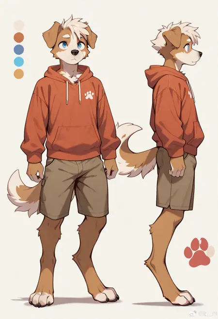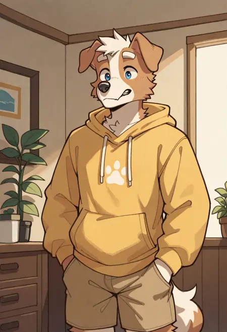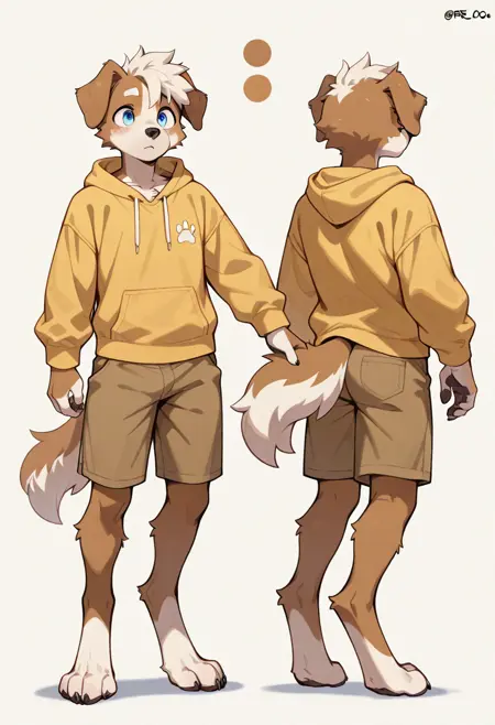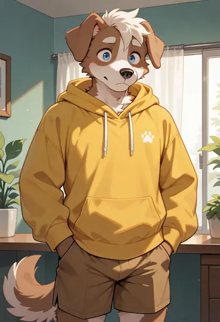 Pony: score_9, score_8_up, score_7_up, score_6_up, high quality, hires, Michi, d0g, furry, 1boy, solo, furry male, male focus, furry, animal ears, floppy ears, dog boy, yellow hoodie, brown shorts, ...your tags...