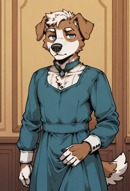 Illustrious: best quality, amazing quality, very aesthetic, absurdres, newest, michi_(oc), solo, 1boy, furry male, furry, dog boy, blue eyes, floppy ears, looking at viewer, ...your tags...