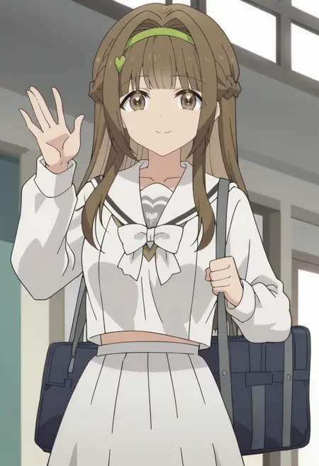 outfit 3: school uniform, bag, school bag, white skirt, white shirt,white bow, long sleeves, white sailor collar white serafuku, bowtie,