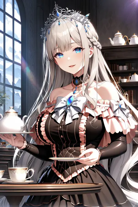 ceteaoujolt, french braid, bare shoulders, black dress, blue eyes, blue gemstone, blue brooch, bow, tiara, very long hair, silver hair, grey hair, light brown hair, choker, frilled dress, frills, jewelry, layered dress, long dress, black sleeves, off shoulder, off-shoulder dress, sidelocks,