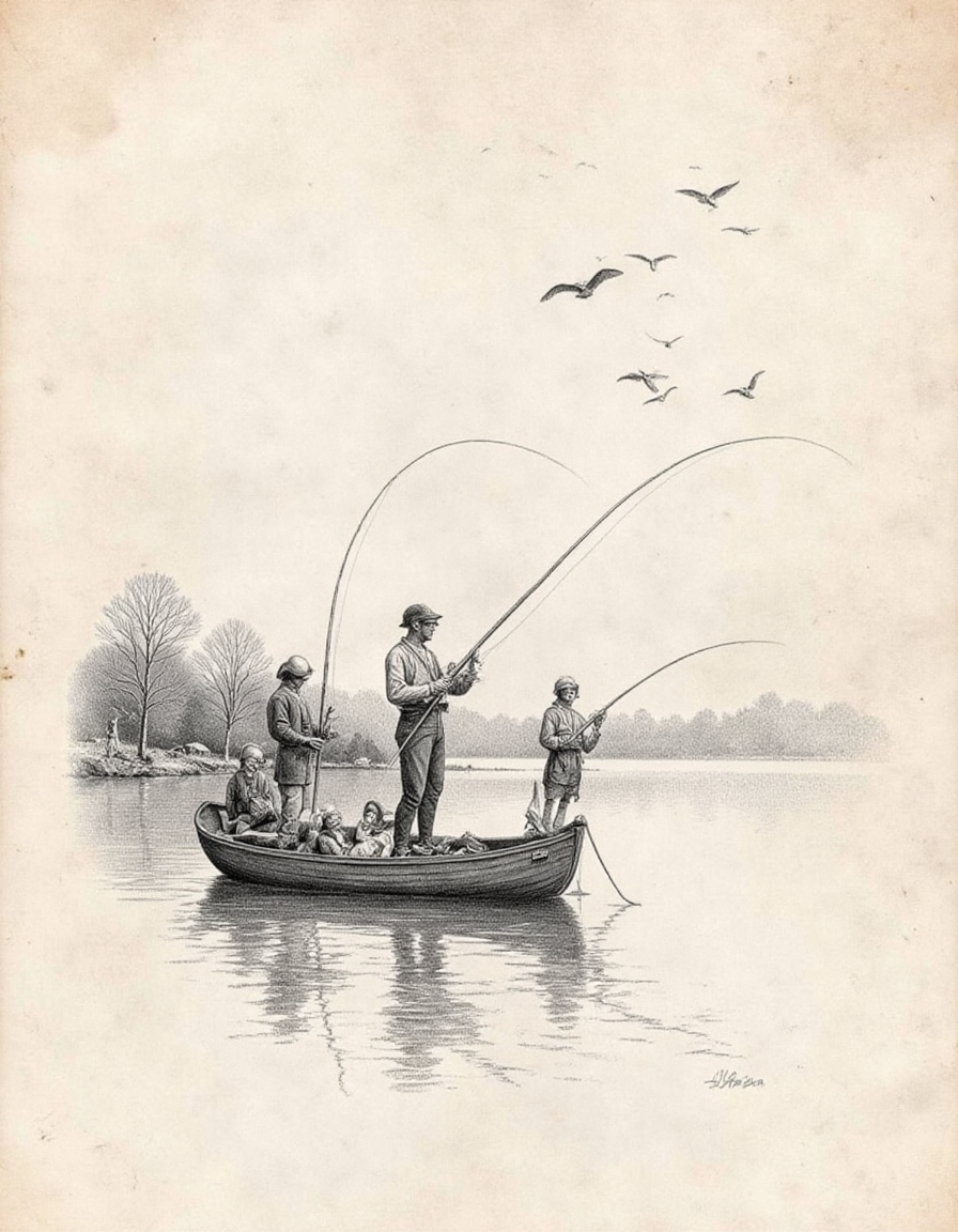 “조용한 호수 위 작은 나무 배에서 어부들이 그물을 던지고 있습니다. 아침 안개가 물 위로 올라오고, 새들이 머리 위로 날아갑니다. anatomica, lora:anatomica\_v60:1,”
