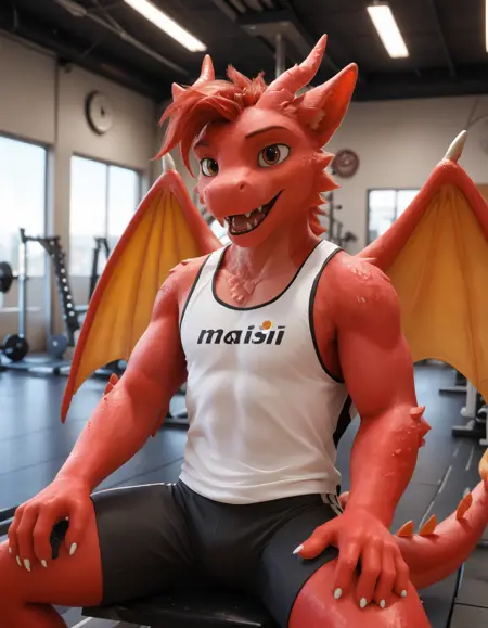 drag0n_lucky, furry, anthro, cute, solo, 1boy, furred dragon, red body, wings, black eyes, body fur, furry male, barefoot, claws, fang, red hair, looking at viewer