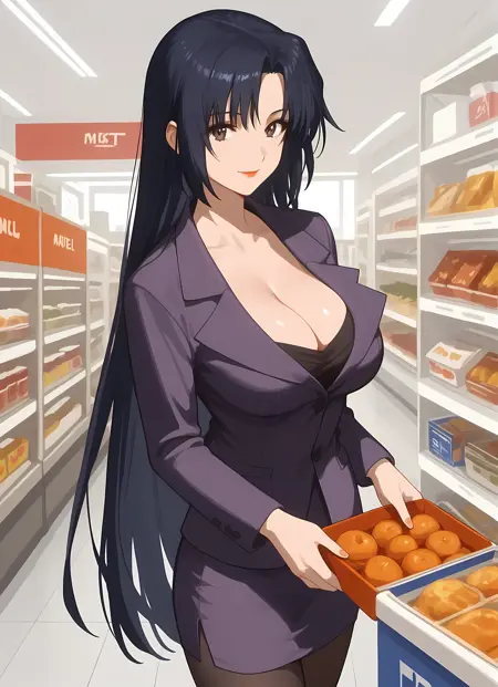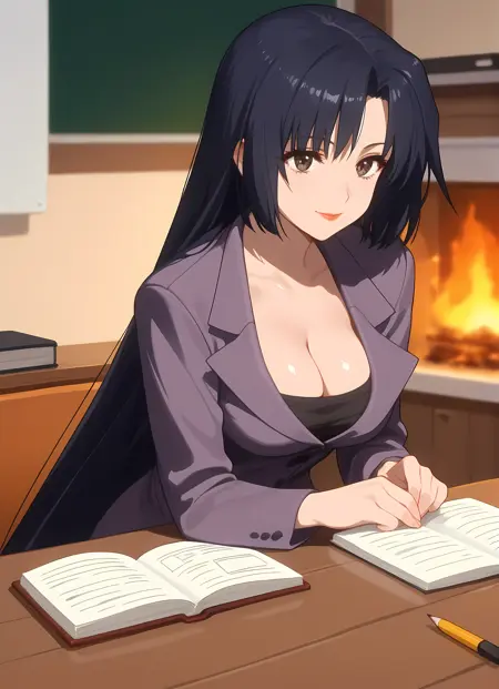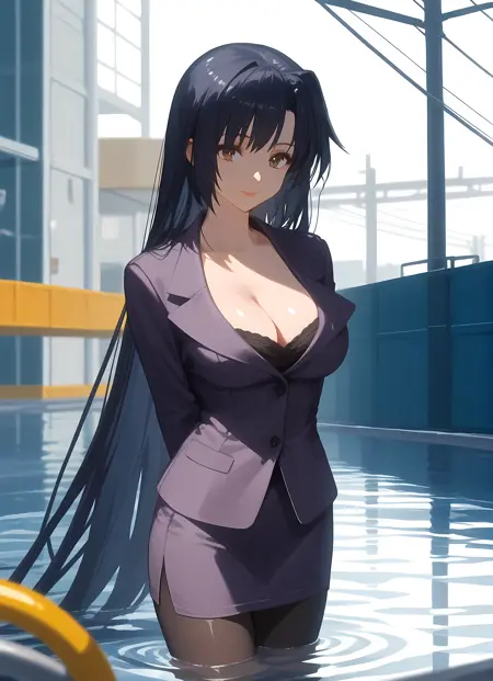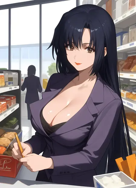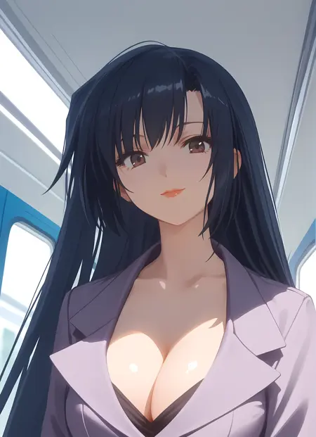 외모 → ohwx, 1girl, solo, solo_focus, black_hair, long_hair, brown_eyes, makeup, lipstick, blue_hair, very_long_hair, breasts, large_breasts,