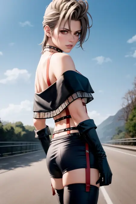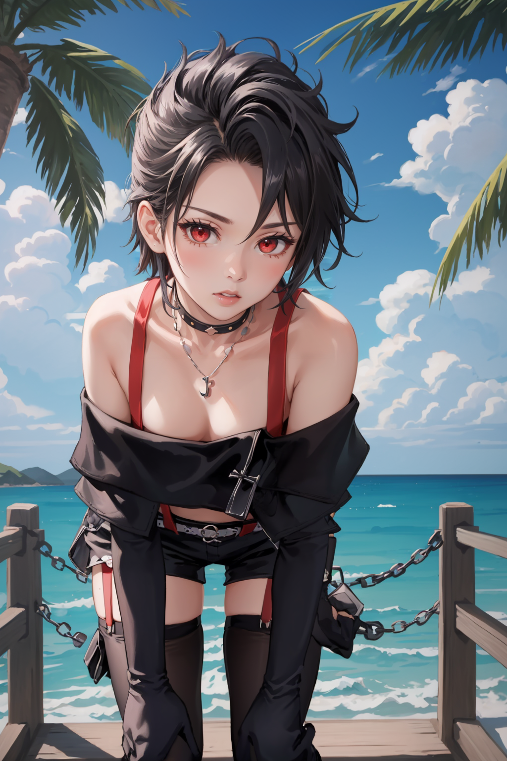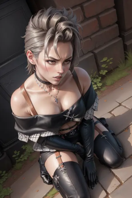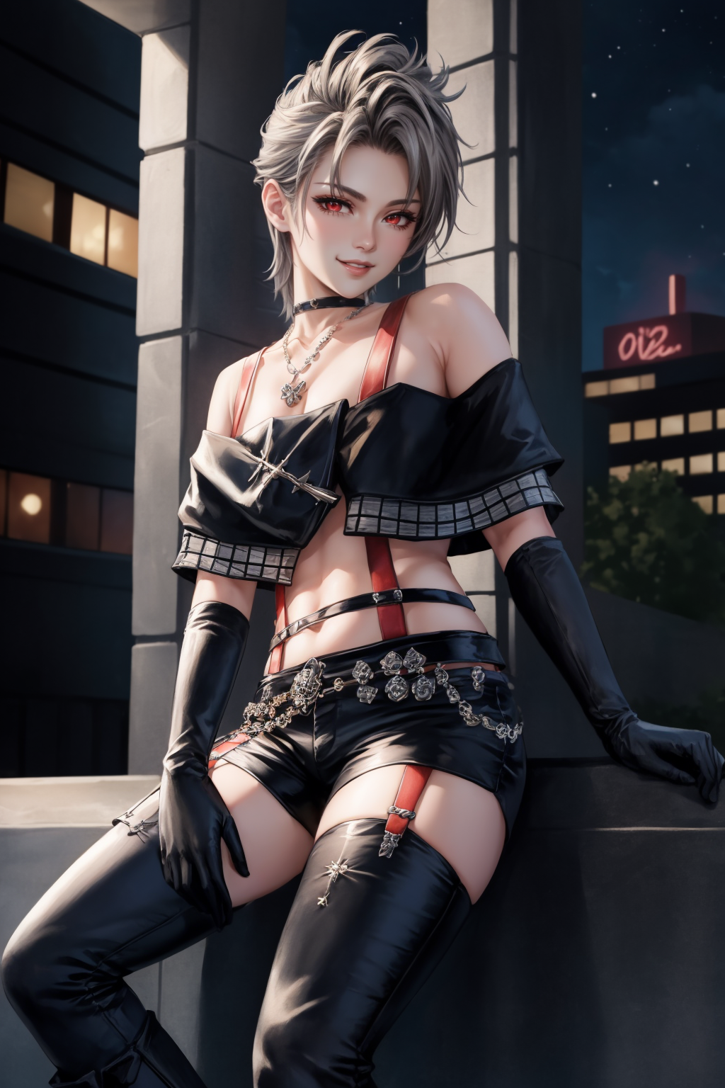 添加“项圈、项链、短款上衣、单肩设计、肘部手套、吊带、黑色短裤、过膝袜、靴子”以呈现她典型的造型。