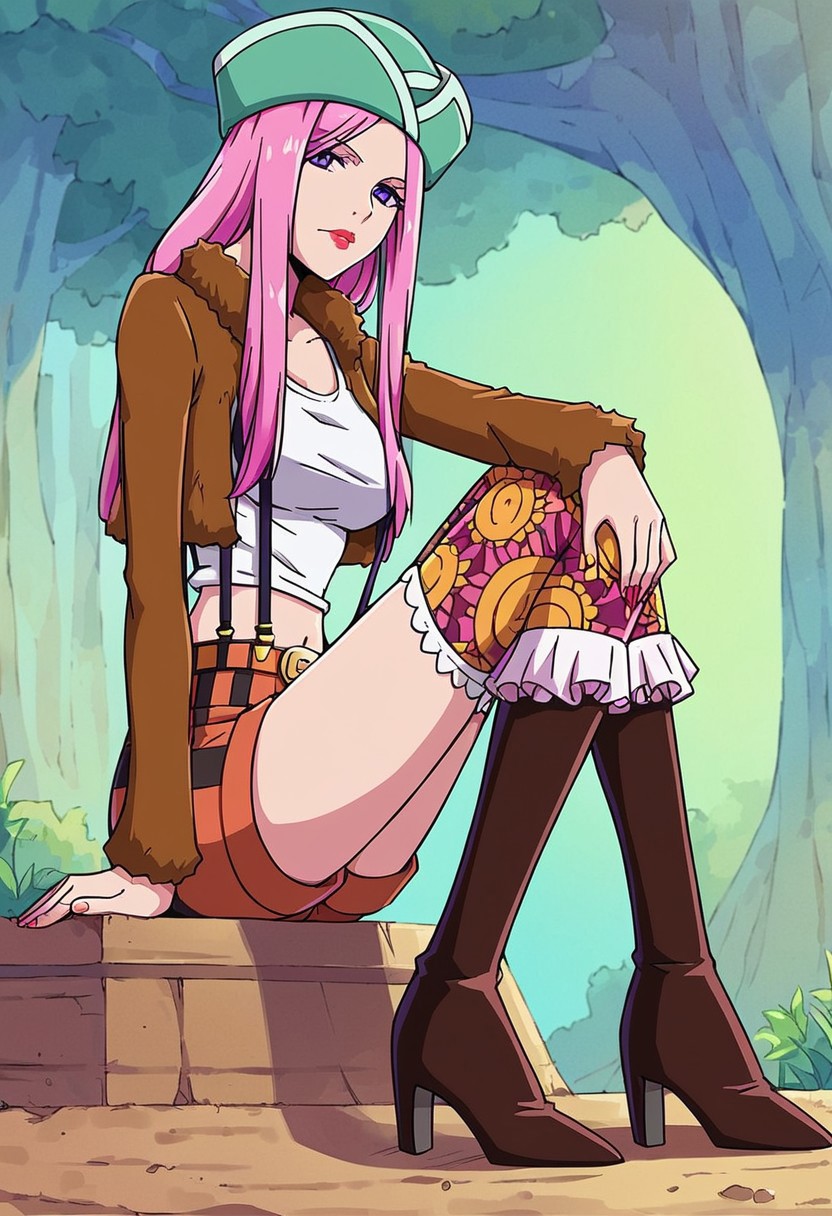 j3welry b0nney, hat, pink hair, long hair, purple eyes, crop top, suspenders, cropped jacket, shorts, thighhighs, high heel boots