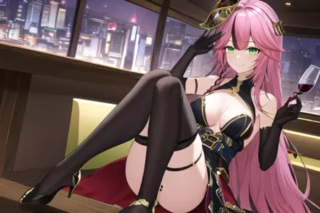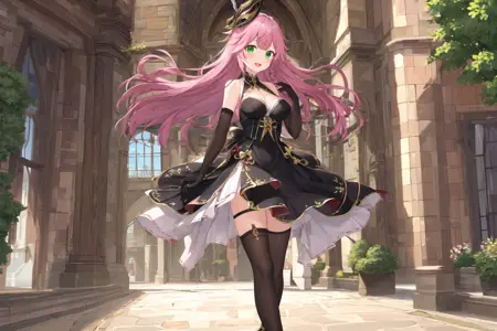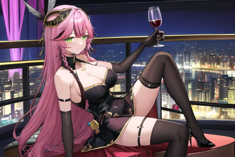 <lora:lan_2_(tower_of_fantasy):0.4> (best quality:1.1), (high resolution:1.1), lan_2_\(tower_of_fantasy\), long pink hair, multicolored_hair, braid, feather_hair_ornament, mask_on_head, green eyes, black_dress, black_gloves, asymmetrical_knee_socks, high_heels