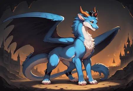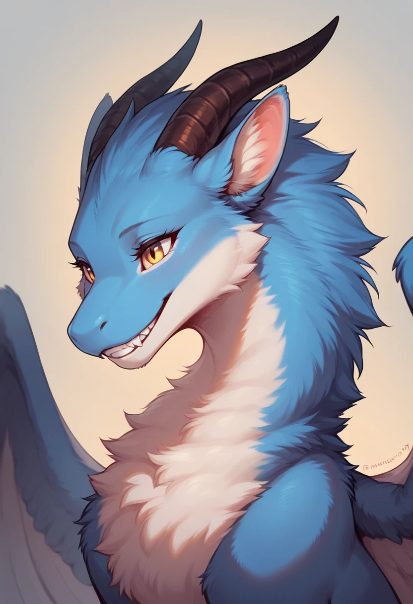 描述 - 毛茸茸的龙,雌性,白色和蓝色毛发,翅膀,角,尾巴,胸部绒毛,爪子,獠牙,背部,淡蓝色眼睛