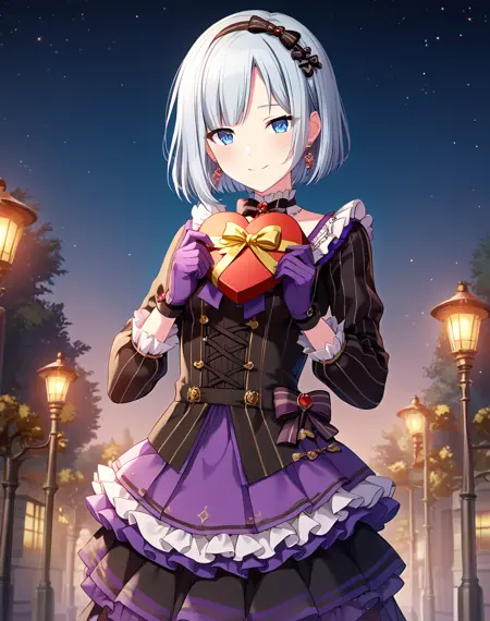 バレンタイン衣装: 手袋、イヤリング、ジュエリー、リボン、持っている、バレンタイン、ギフト、ドレス、長袖、ミディアムヘア、黒いレースのドレス、紫の手袋、
