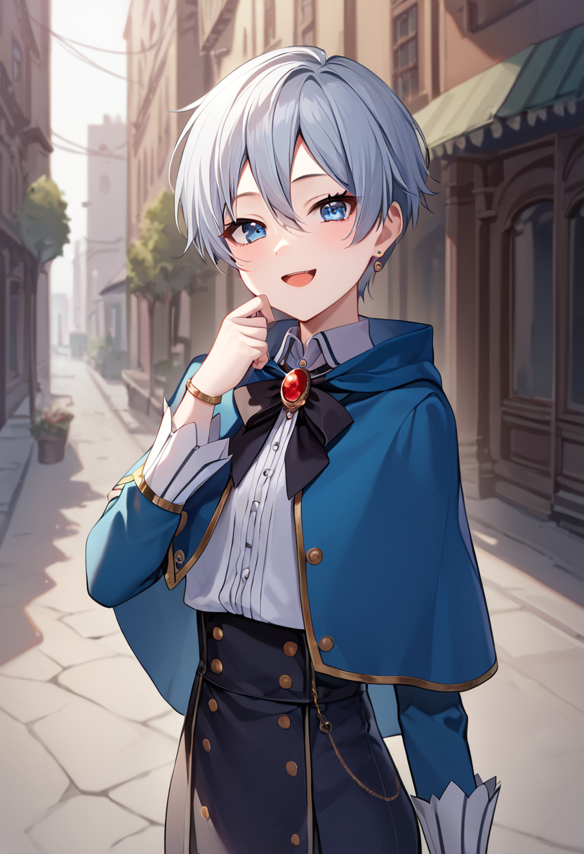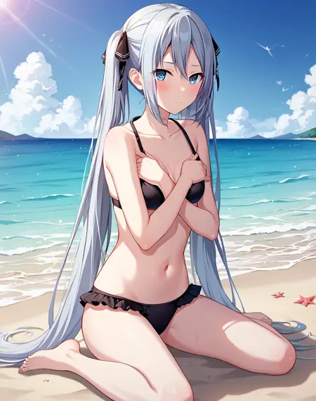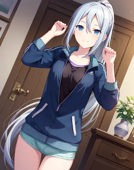 トリガー語: yoisaki_kanade、グレーの髪、非常に長い髪、青い目、目の間の髪、公式アート、