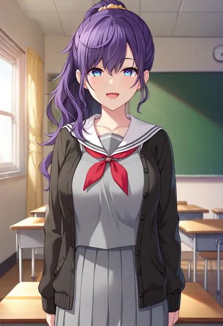 校服:校服,百褶裙,黑色开衫,灰色衬衫,敞开式开衫,黑色连裤袜,水手领,水手服,敞开式服装,灰色裙子,蓝色眼睛,百褶裙,白色水手领,红色领巾,
