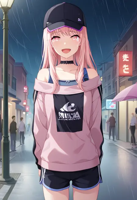 ストリート衣装: ハット、ショートショーツ、チョーカー、オフショルダー、黒い頭部装具、黒いチョーカー、鎖骨、シャツ、前髪、ルーズな髪、ストリート衣装、ピンクのオフショルダースウェット、青いストラップ、