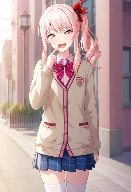 制服: 制服、スカート、カーディガン、リボン、シンクレッズ、チェック柄、チェック柄スカート、白いシンクレッズ、赤いリボン、長袖、ベージュのカーディガン、ピンクの襟、チェック柄リボン、