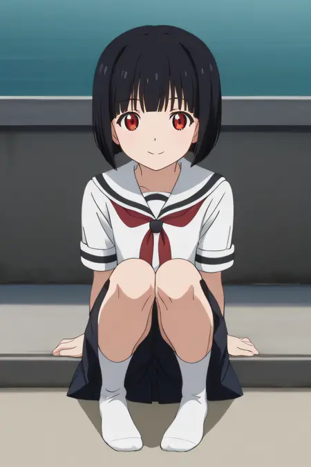 saegusa, black hair, red eyes, bob cut, flat chest, serafuku, red neckerchief, black pleated skirt