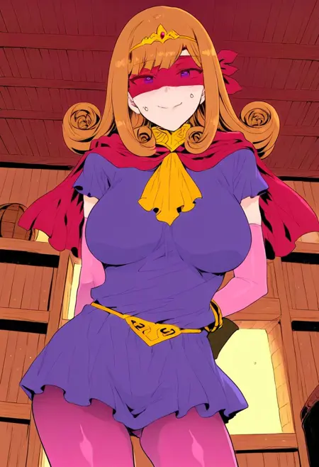 1a. ((빨간 투명 실크 마스크, 빨간 보석이 박힌 금색 왕녀 관모, 짧은 빨간 영웅 망토, 섹시한 분홍색 짧은 소매 드레스, 섹시한 손가락 없는 분홍색 팔장갑, 분홍색 팬티스타킹, 금색 팔찌, 빨간 보석이 박힌 금색 허리벨트, 금색 초크 칼라, 금색 실크 목수건, ))