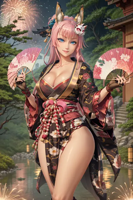 • urielmatsuri - Add "japanese clothes, kimono, fox mask, hair ornament, cleavage, fingerless gloves, long hair, hand fan" for best results.