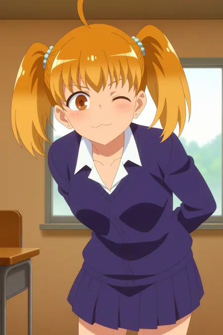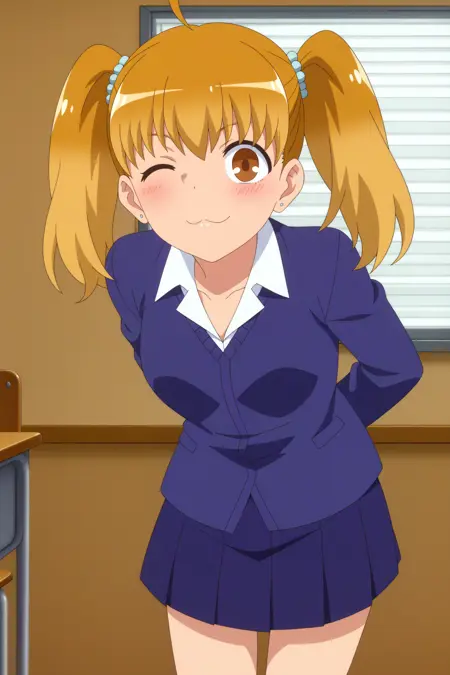 Triggers : yoshi ,twintails,brown eyes, jewelry,ahoge,:3,school uniform