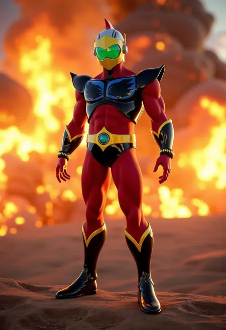 일상 복장은 (DukeFleed, man, brown hair, eye level, wearing yellow shirt, dark brown vest, brown pants, black belt) 프롬프트를, 비행복은 (DukeFleed, man, pilot suit, helmet on/no helmet, green visor, heroic pose) 프롬프트를 사용하고, 강도는 0.8에서 1 사이로 설정하세요.