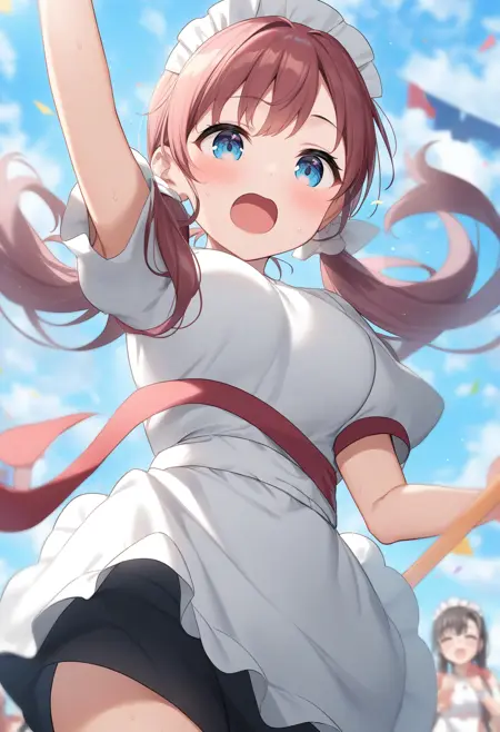 エプロンなどリボンのような物が含まれている服と併用すると混ざってしまってまともに出ないかもしれません。gym uniform, bouncing breasts, outdoors, running, sports festival 辺りから必要なものを入れてください。