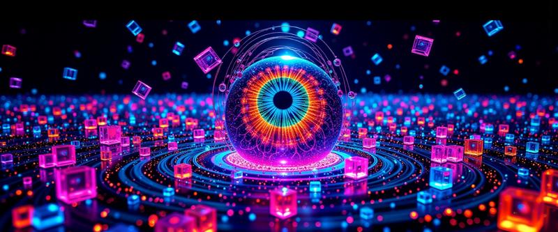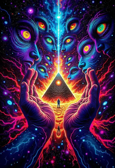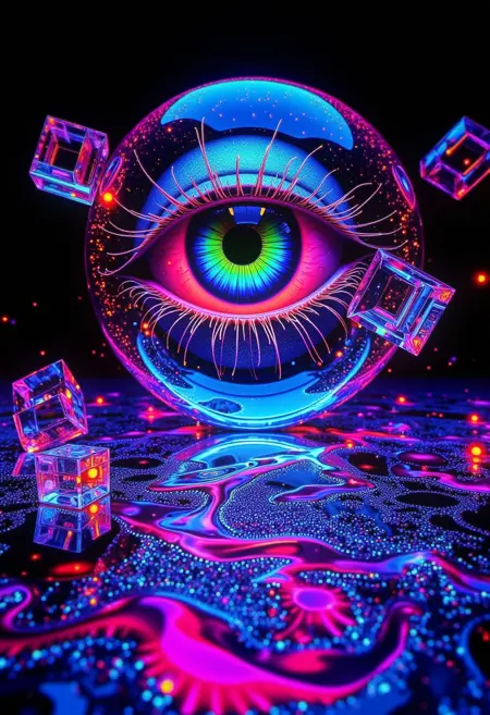 シュールなビジュアル:無限の虚空に浮かぶ巨大な目がゆっくりと回転し、虹彩は変化するネオン色で脈動する。周囲では幾何学的形状がリズミカルなパターンで公転し、それぞれの形が空中で溶けては再形成される。液体の光で満たされた透明な立方体が近接して浮かび、その表面にはフラクタルの反射が波打つ。bo-サイケデリックなエネルギーの線が物体の間を流れ、通過するたびに空間を歪める。目がまばたきすると、全体のシーンは新たな抽象的形態へと歪み、現実が魅惑的なシュールなビジュアルのディスプレイへと変わる。