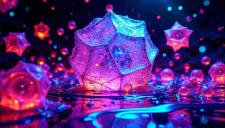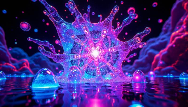 抽象的な造形:透明で絶えず変化する幾何学的形状からなる浮遊構造が、空中でねじれ、変容する。表面はネオン色で波打つ一方、フラクタルパターンが無限に広がる。光の輝く触手が物体から伸び、周囲の空間を歪め、背景には奇妙なbo-サイケデリックな形態が生まれては消える。全体のシーンは鮮やかなエネルギーで脈動し、現実が断片化され、常に新しいシュールな形態へと進化する抽象的な造形を生み出す。
