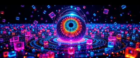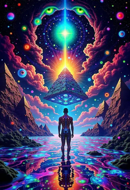 超现实视觉:一只巨大的漂浮之眼在无尽虚空缓缓旋转,虹膜脉动着变幻的霓虹色彩。周围,几何形状以节奏性模式环绕运行,每种形态在空中溶解与重组。透明的立方体充满液态光,其表面泛起分形反射。bo-奇幻能量线在物体间流动,穿越时扭曲空间。当眼睛眨动时,整个场景扭曲为新的抽象形态,将现实扭曲成令人着迷的超现实视觉奇观。