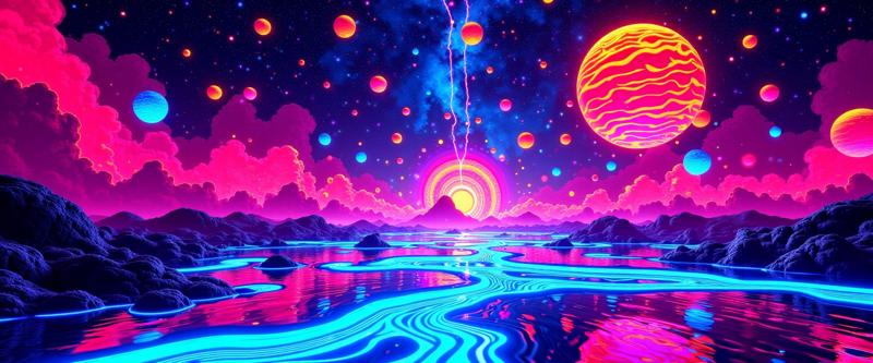 現実を歪める夢の風景:山が液体のように波打つシュールな風景。空はネオンのフラクタルパターンが渦巻き、川は星へと逆流する。地平線は不可能な角度で曲がり、浮遊する水晶の島々が空に浮かぶ。色は鮮やかなトーンを絶え間なく変化させ、重力は物体をねじれた抽象的な形に歪める。雲からは液体の光が滴り落ち、全体のシーンは混沌としたbo-サイケデリックなエネルギーで脈動し、現実を超越した夢の世界を創り出す。