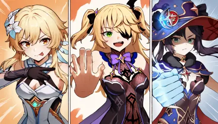 또한 3명의 캐릭터가 있는 이미지를 생성한 후, 제가 Genshin 이미지에서 했던 것처럼 원하는 캐릭터로 각 판넬을 인페인팅할 수 있습니다.
