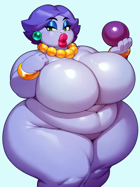 Main Tags: 1girl, solo, colored skin, makeup, jewelry, pearl earrings, pearl necklace, green eyes, eyeshadow, bracelet, big lips, short hair, breasts.