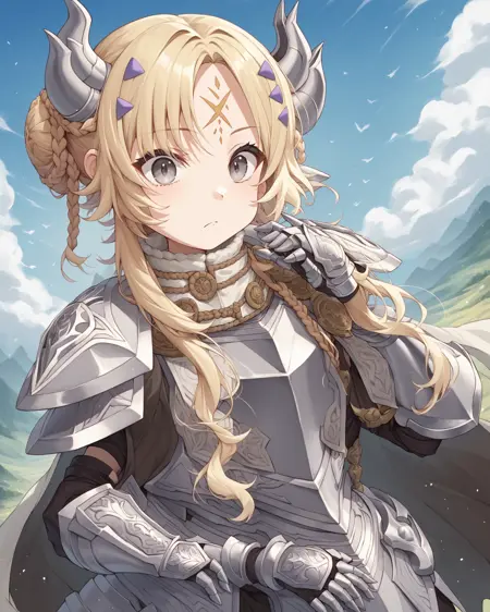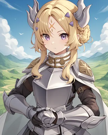 Dogmatika Ecclesia, 1girl,solo, blonde hair, (gray eyes),forehead mark, armor, forehead mark,braided bun,long side hair, horns, bangs, breastplate, hair ornament, parted bangs,gauntlets,cape,breastplate,duel monster,