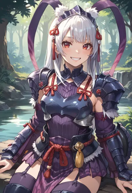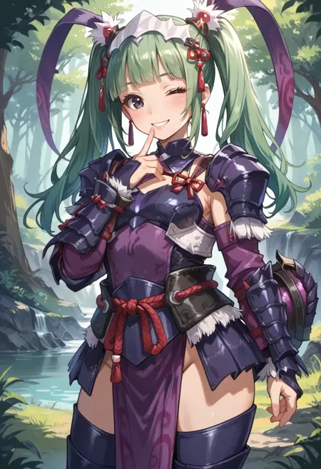Tags (clothes): yian garuga armor, purple vambraces, purple feather headdress, purple shoulder armor, purple thigh boots, purple pelvic curtain, purple breastplate