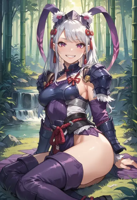 Tags (clothes): yian garuga armor, purple gauntlets, purple feather headdress, purple shoulder armor, purple thigh boots, purple pelvic curtain,