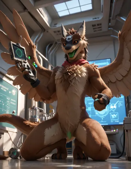 // NoobAI: c4rc4r, feathers, solo, wings, hi res, male, feathered wings, tail, furred dragon, dragon, brown fur, black head, fingerless gloves, no humans, male focus, gloves, orange sclera, looking at viewer, green mouth