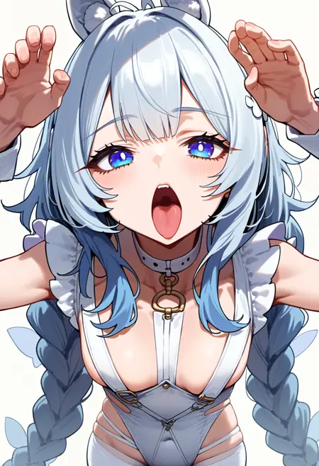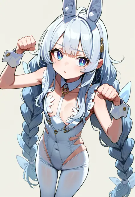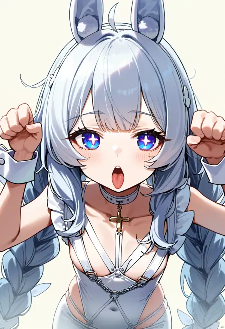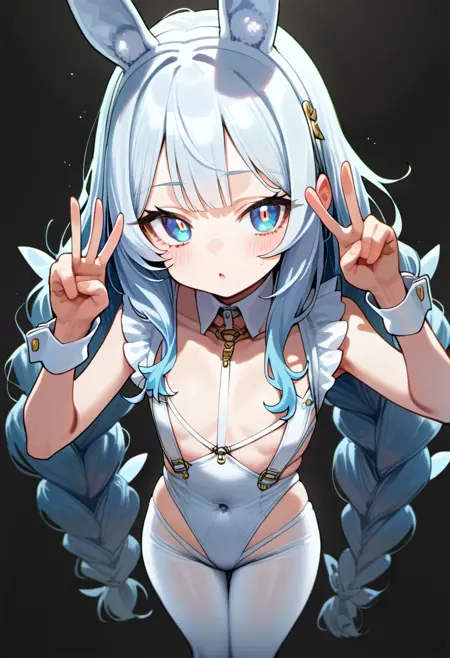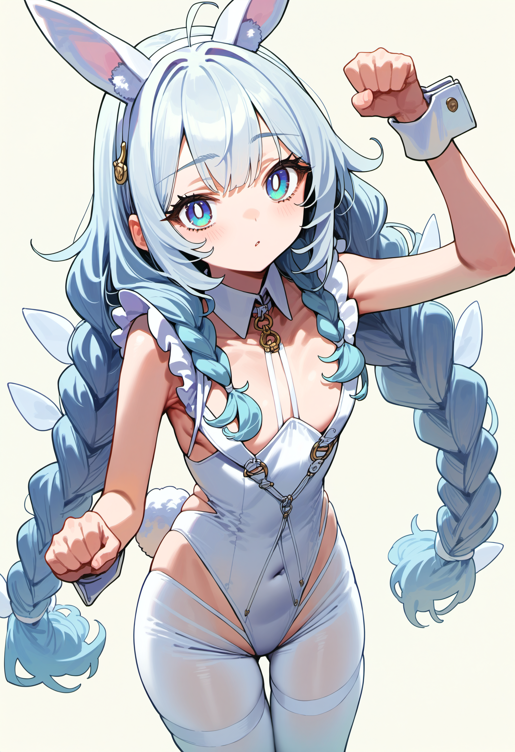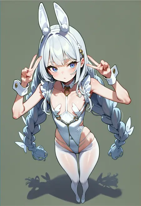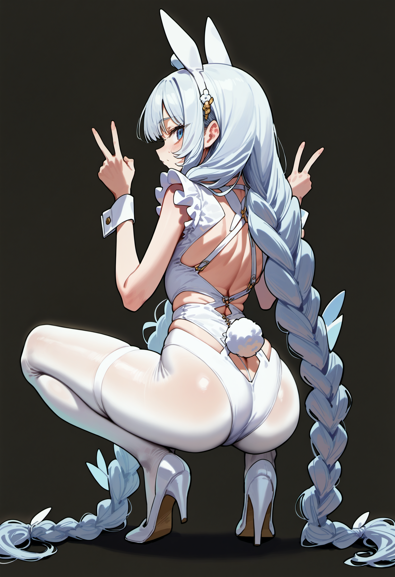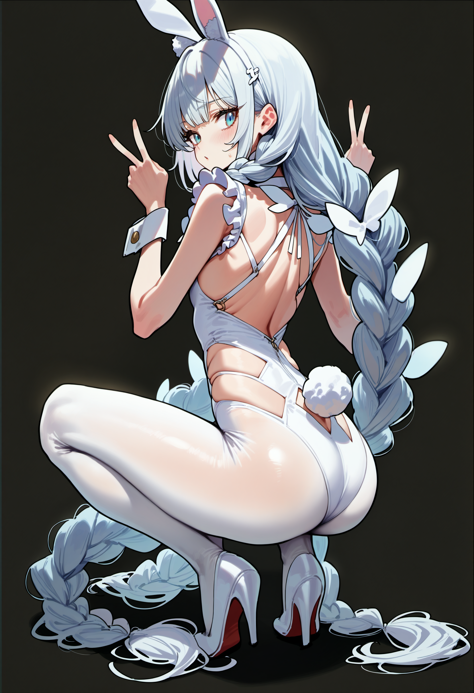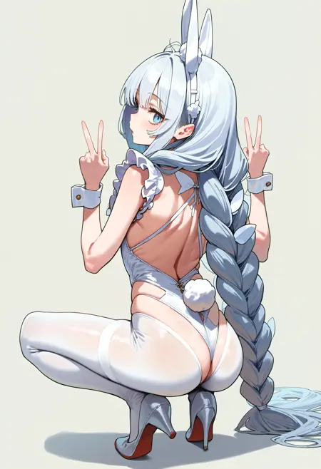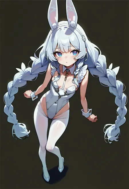 推荐提示词(正确着装):白发,极长发,双马尾,白色兔女郎装,白色连裤袜,+_+,符号形状的瞳孔