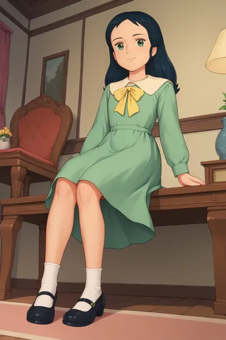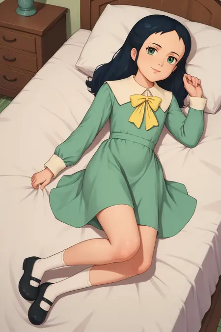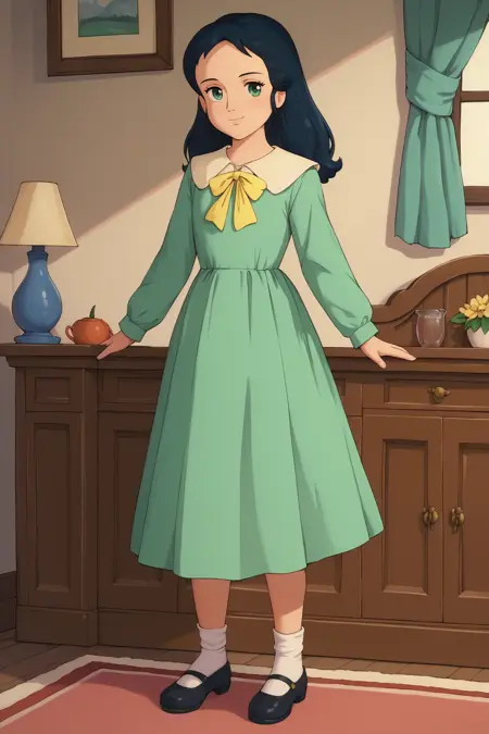 ➜ SaraMorrisLSXL, 绿色眼睛, 黑色长发, 女孩, 平胸, 绿色连衣裙, 黄色蝴蝶结, 长袖, 绿色裙子, 白色袜子, 黑色鞋子