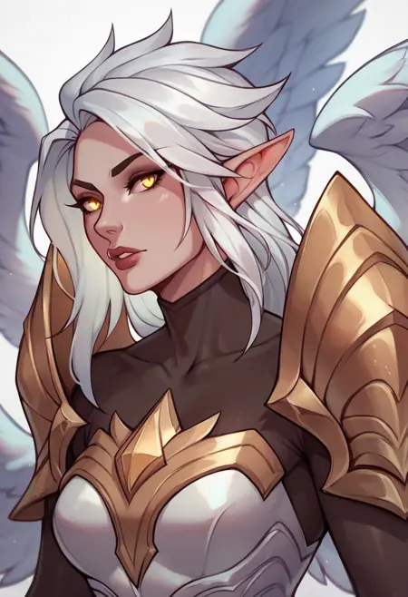k4yle, kayle, 1girl, yellow eyes, long hair, pointy ears, white hair,