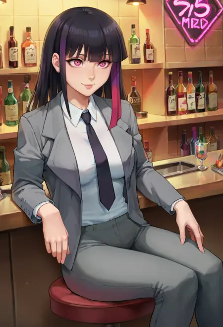 rouge redstar, 1girl, long hair, black hair, streaked hair, blunt bangs, pink eyes