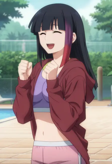 purple sports bra, pink short shorts, open hoodie, red hoodie