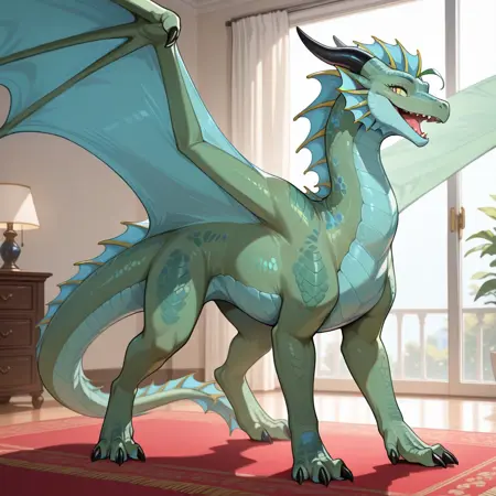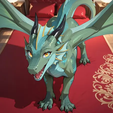 附加提示词:龙、绿色鳞片、斑点身体、黄色眼睛、头部鳍、尾巴、鳞片、爪子、野兽型、雌性、黑色角、翅膀