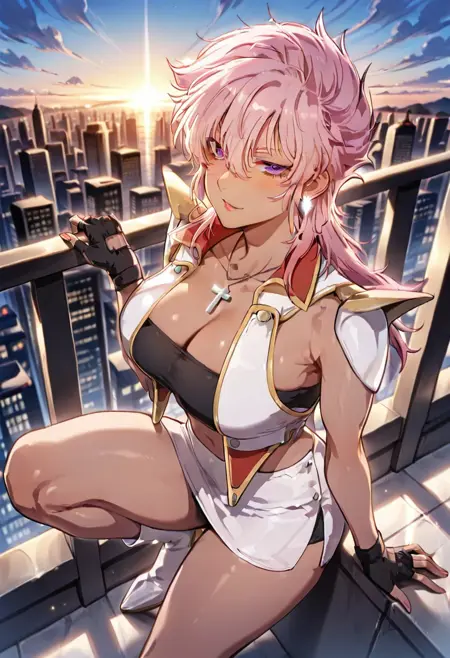 伊利娅,深色皮肤,短裙,粉色双马尾发型,粉色眼睛,红唇