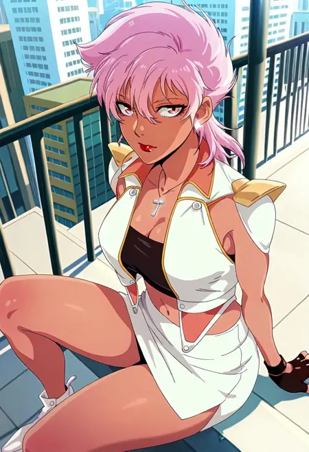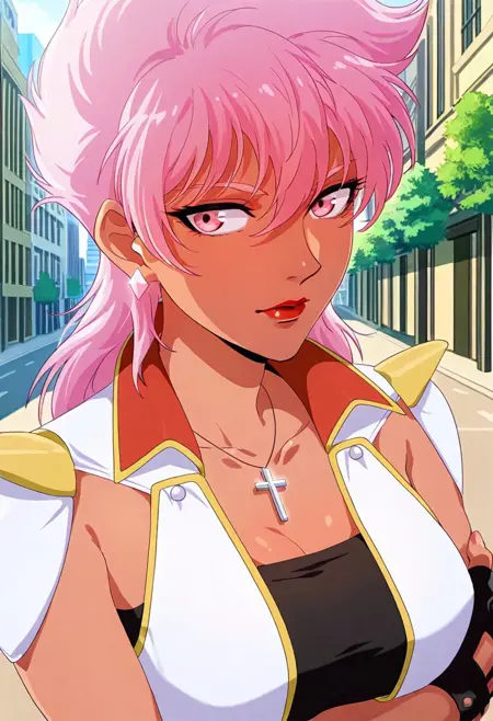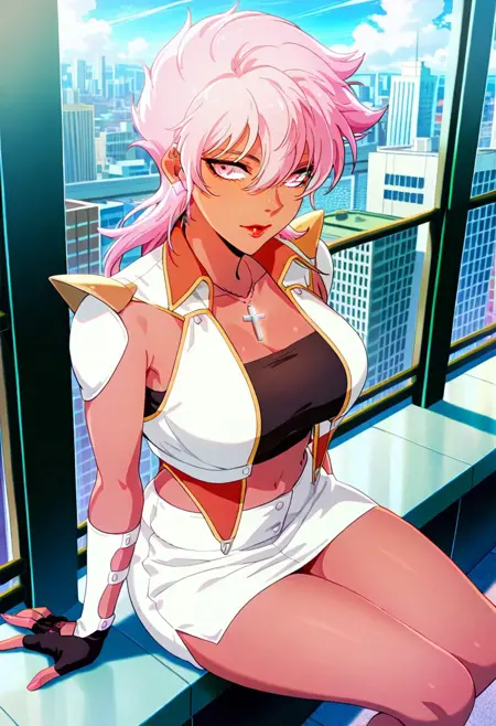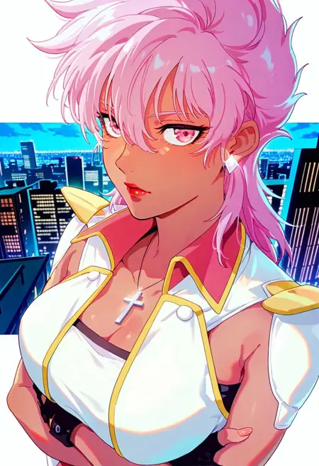 イリア、暗い肌、短いスカート、ピンクのツインテールヘアスタイル、ピンクの目、赤い唇、女性(または成熟した女性)