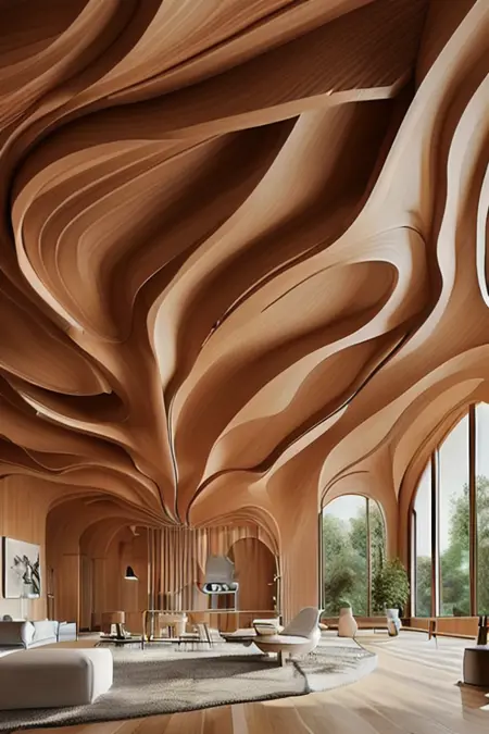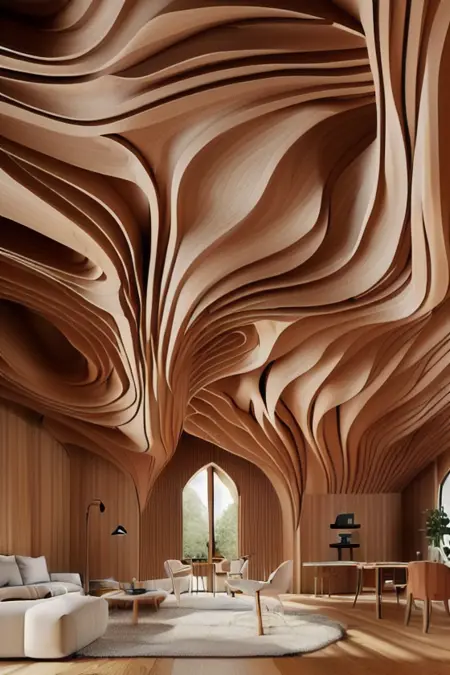 用于现代客厅、大厅或卧室室内设计的木纹波浪天花板风格的LoRA。