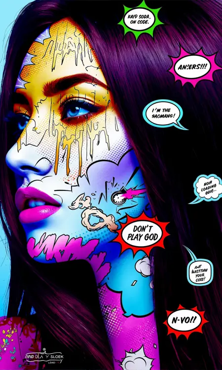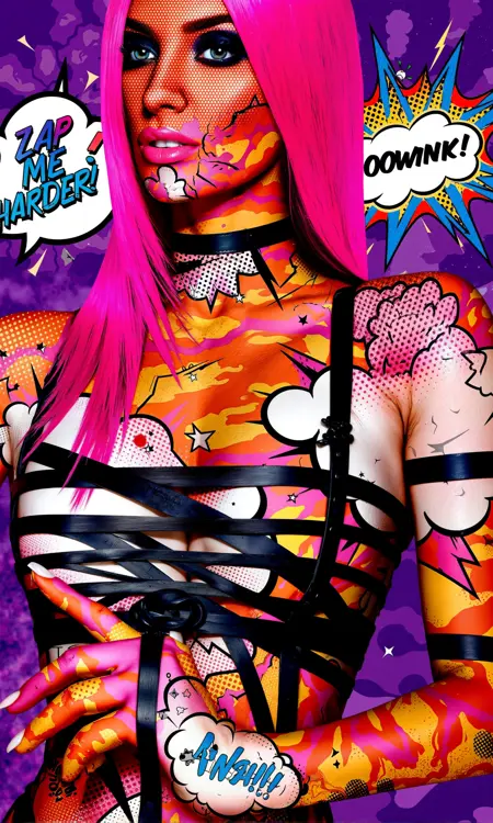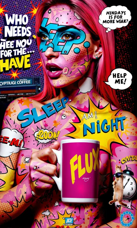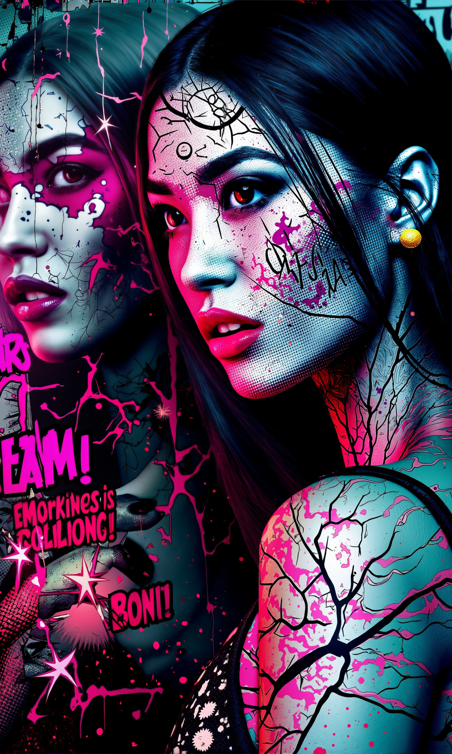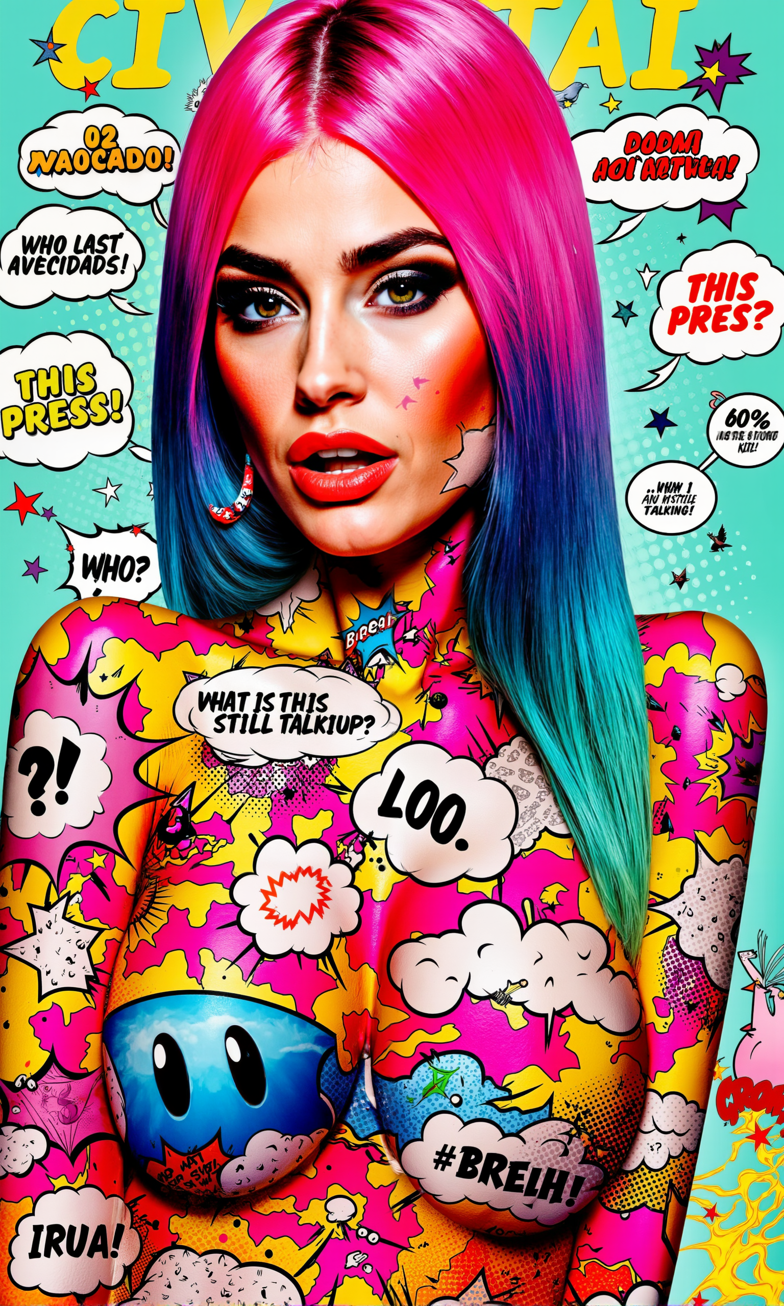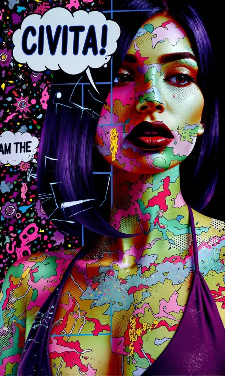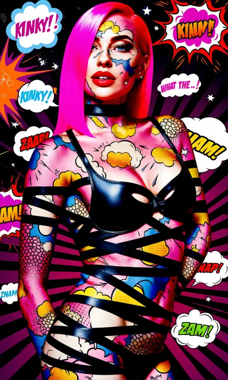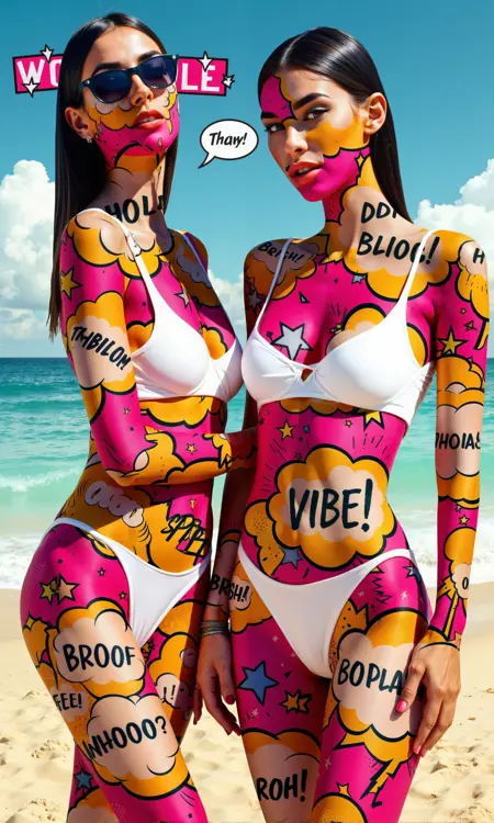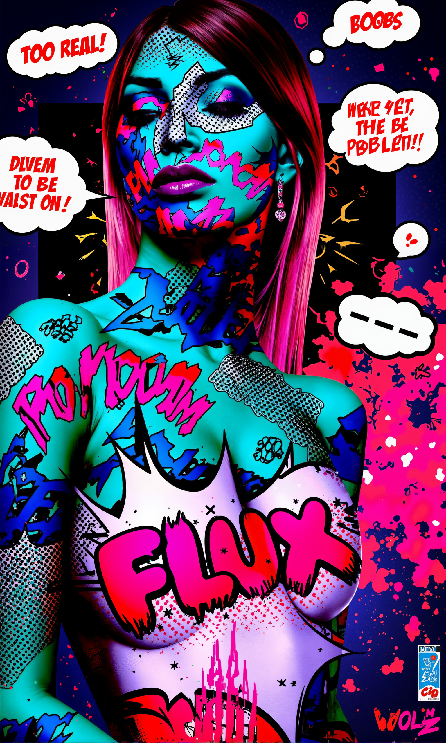 风格是一种充满活力、受波普艺术启发的漫画美学,采用大胆、对比鲜明的色彩和戏剧性的图形文字元素,营造出充满活力和动感的视觉冲击,其中LoRA技术将人类皮肤转化为类似漫画的纹理,增强了整体的图形效果。