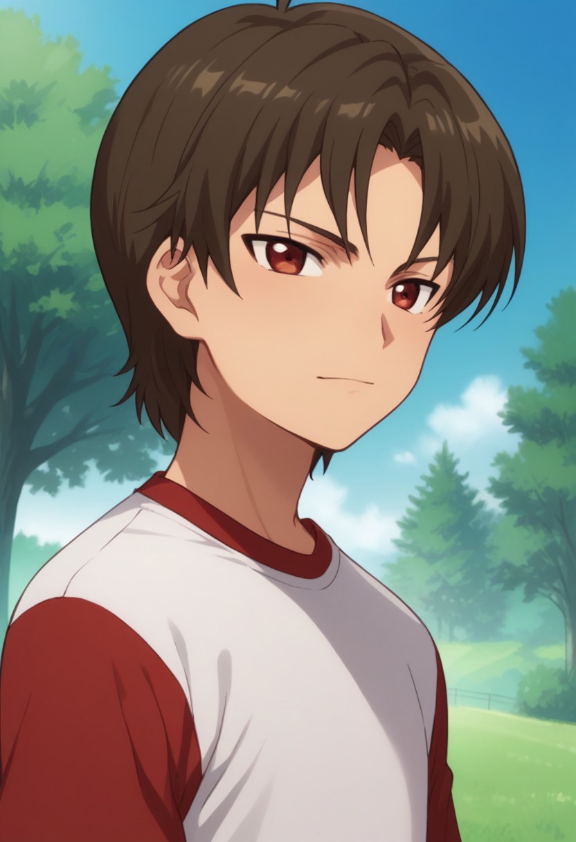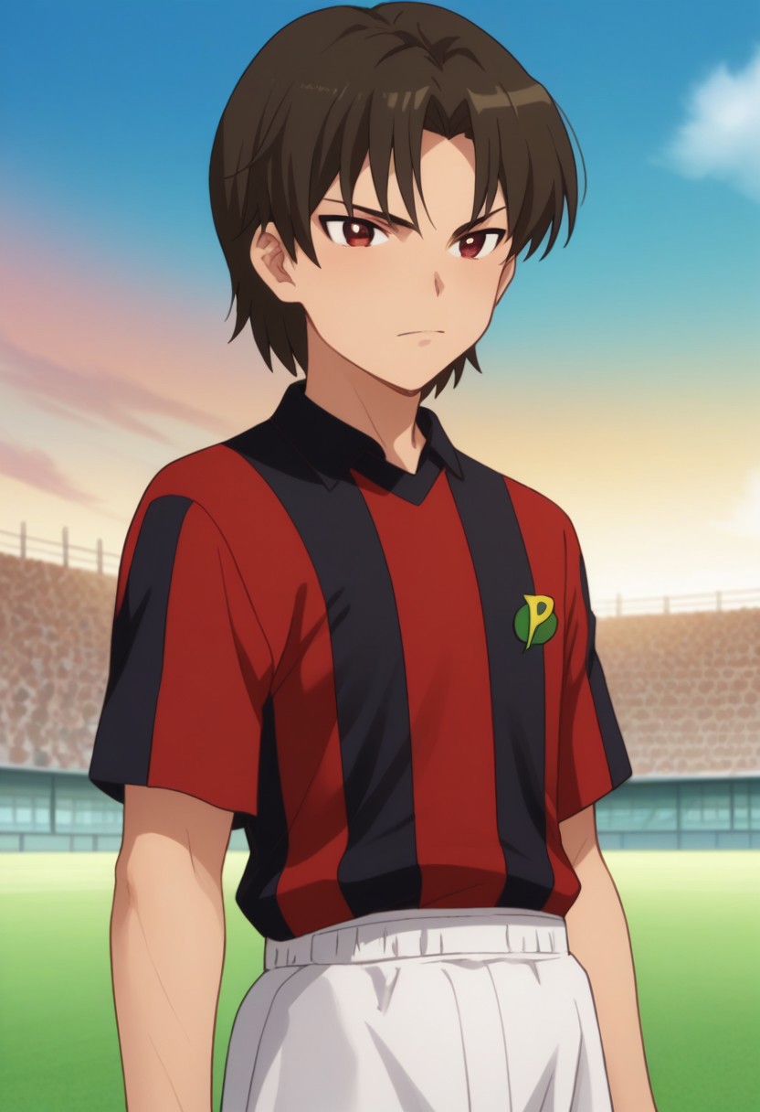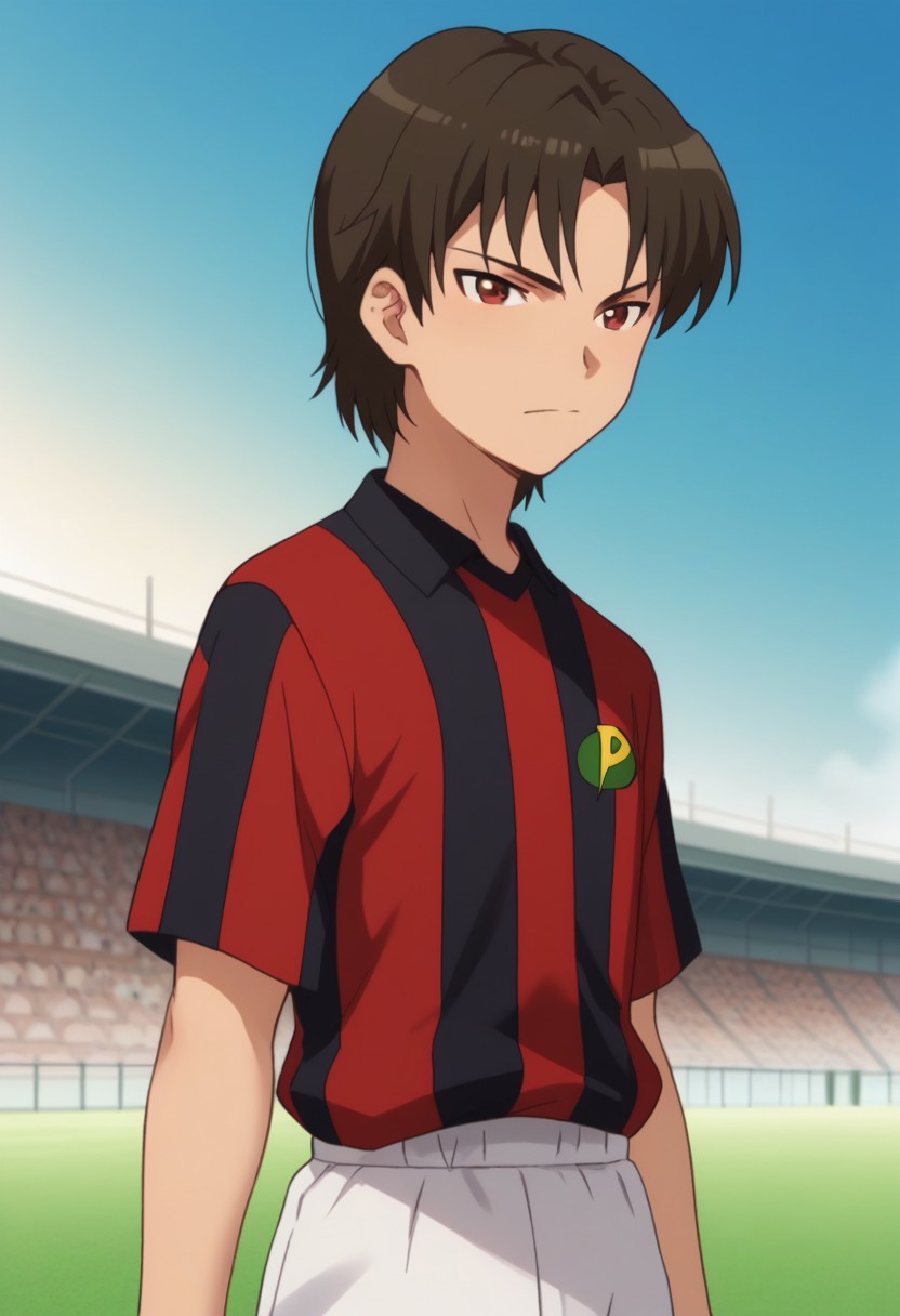 ouzou, 1boy, male focus, sportswear, solo, soccer uniform, brown hair, red eyes, striped, black shirt, red shirt, white shorts, socks, shoes
