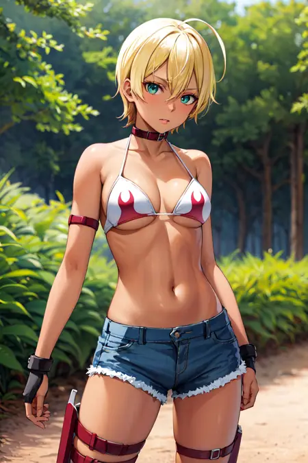 아웃핏2mi1, 흑색 피부, 금발, 아호게, 초록색 눈, 파랑색 눈, 수영복 상의만, 수영복, 짧은 반바지, 칼라, 청바지 반바지, 허벅지 허리호월