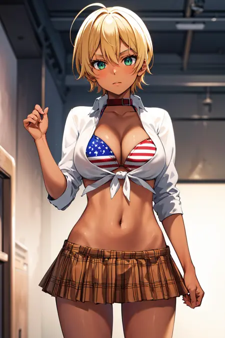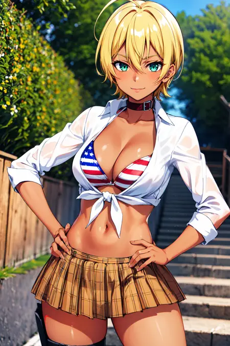 아웃핏1mi1, 흑색 피부, 금발, 아호게, 초록색 눈, 파랑색 눈, 미국 국기 수영복, 체크 무늬 스커트, 칼라, 수영복 상의만, 매듭 지은 셔츠