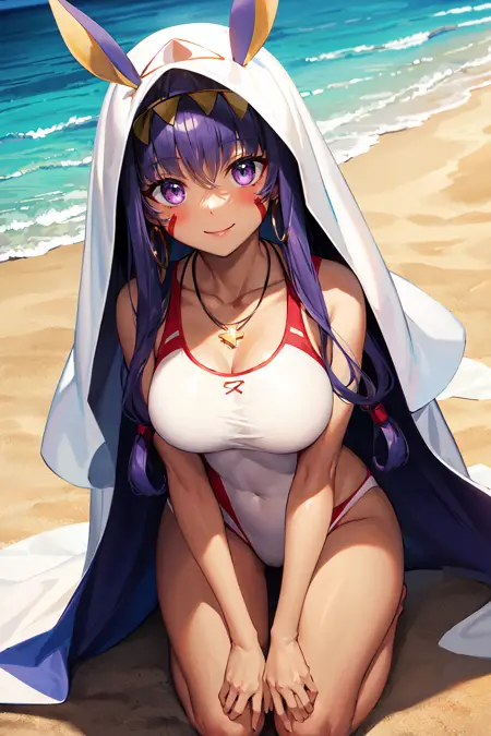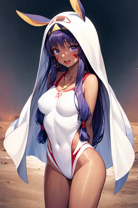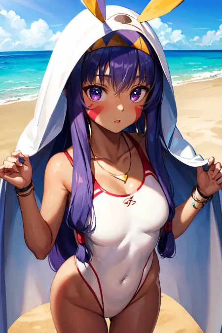 服饰3nit1, 动物耳朵, 深色皮肤, 长发, 面部标记, 发带, 白色连体泳衣, 白色泳装, 饰品, 项链, 锁骨, 白色披肩, 帽兜竖起